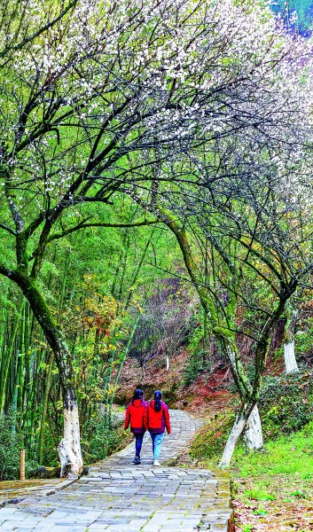 1月9日,江西省赣州市大余县梅关古驿道两旁的梅花次第绽放,吸引了不少游客前来赏花。梅关古道始通于秦汉,是全国保存最完整的古驿道。刘志勇摄/光明图片