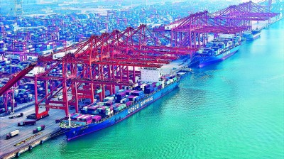 近日,在广西北部湾港钦州自动化集装箱码头,满载货物的巨轮在岸边装卸。今年前三季度,钦州港外贸进出口总值同比增长29.17%。新华社记者 张爱林摄