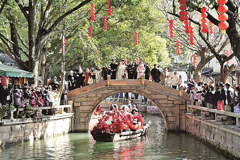同里的年味儿,藏在摇橹声里,更裹在甜蜜里。作为江南六大古镇之一、首批中国历史文化名镇,这里的水是活的,流传百年的水乡婚俗,更是越来越红火。