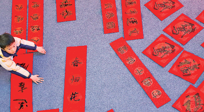 小朋友在江苏省海安市政协书画联谊会送福字、赠春联文化惠民活动现场观赏书法作品。新华社发