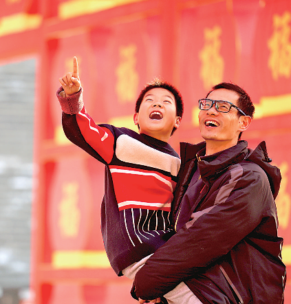 游客在山东省临沂市郯城县郯国古城景区观看福字花灯。张春雷摄/光明图片